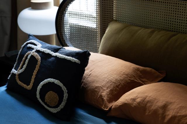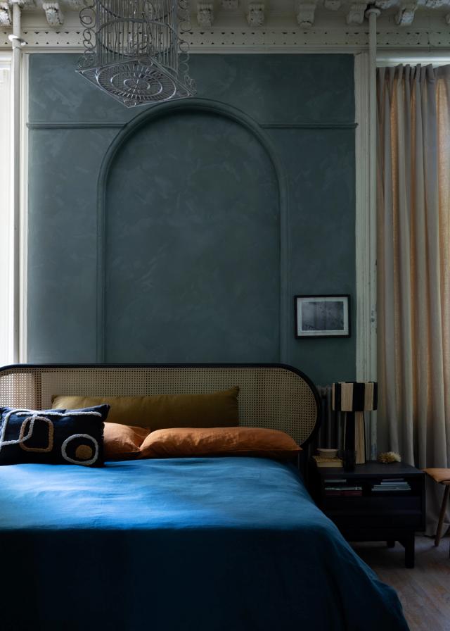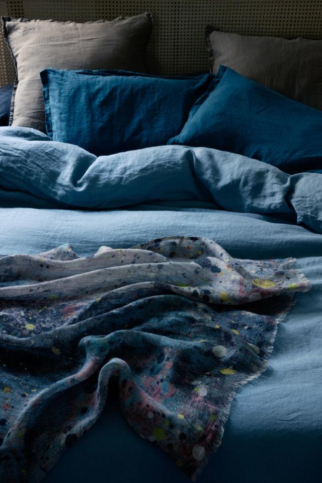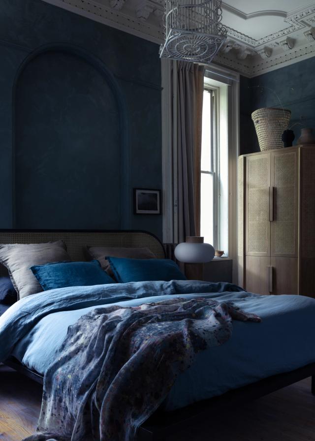 When in doubt, layer. The bed takes on a dramatic, cocoon like allure with the layering of darker hues in shades of petrol, steel and olive.