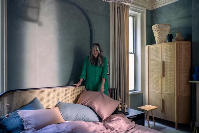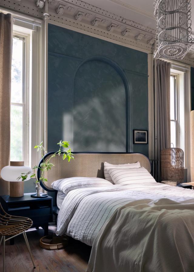 Hilary Robertson's charming bedroom features the Anais Bed from Crate and Barrel. Recycled cotton body pillow from Suay Sew Shop, Linen pillowcases in cedar by Cultiver, Duvet cover in dark teal by CB2, Abstract pillow from Jao Brand.