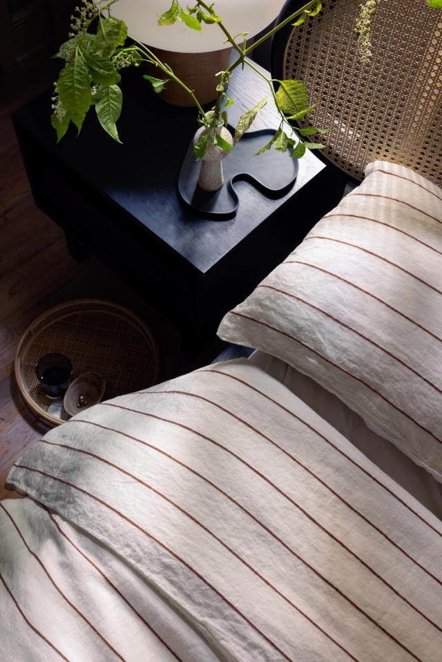 Fresh striped linen transforms the bedroom into a bright and airy oasis. The brown is an unexpected alternative to blue, and a thinner stripe adds sophistication.