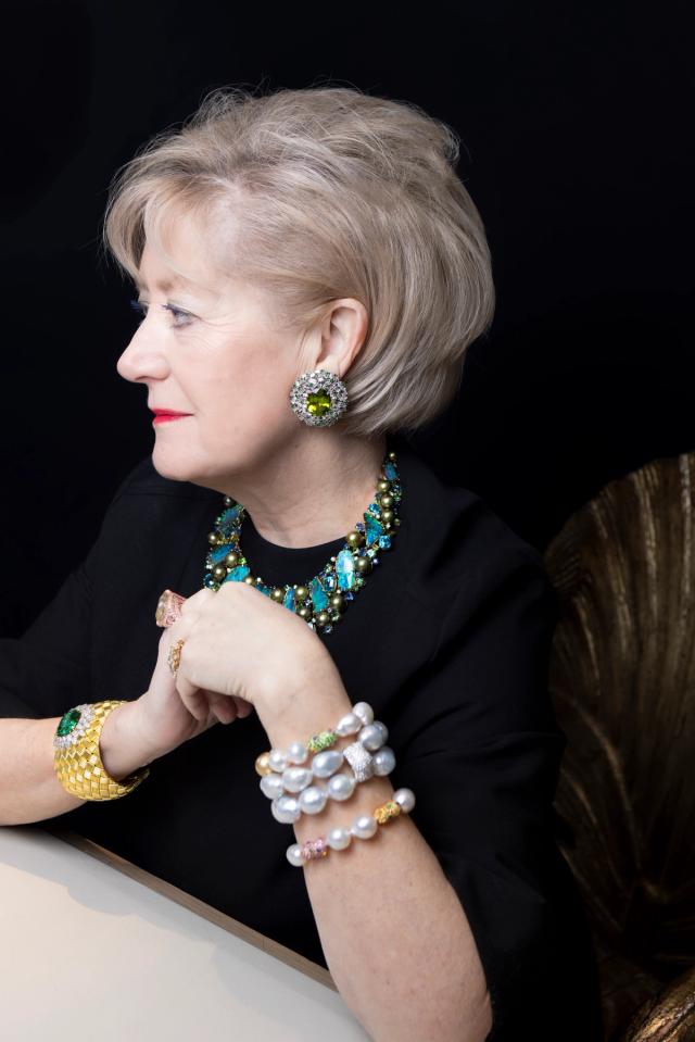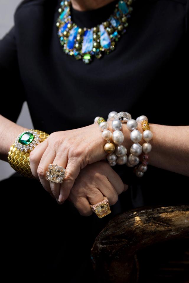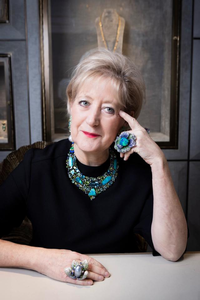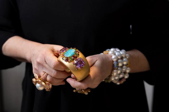 When we first speak, she is in Los Angeles, natch. There is no small talk; everything she says is pronounced firmly, and with the assurance of someone who has lived and seen more than a little, which she has, at 65. Hers is a fascinating back story, and she might have simply grown up as someone who wore jewels, not made them. (She does both.) But her roots lie in the ordinary rural town of Toowoomba in 1884, when her ancestor John McKinney – an immigrant from Northern Ireland – established a McKinney’s store in town. Many decades later, Margot’s own childhood was infused with memories of playing in the department store and being mesmerized by the woman hired to write on the for-sale tickets of items with her beautiful handwriting. Color was everywhere, albeit in a sophisticated fashion: McKinney remembers the stunning pink and gold marble Florence Broadhurst wallpaper in the halls of her family home, while the bedroom she grew up in was a sophisticated chocolate brown in full gloss. On those walls, a painting of hot pink, aquas and yellows, by the aforementioned ticket-writer. “I think that’s something that runs in our family,” she muses. “We have a good sense of color.” And a strong aesthetic, it would seem, based on McKinney’s own look. Her chic ensembles often mix the sedate and refined with the eye-catching; she will pair an elegant black dress with wild Gucci snake-motif boots or green leopard-spot pantyhose, a sartorial exclamation point to the dazzling jewels that she wears.