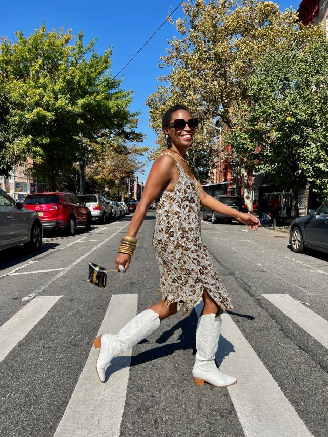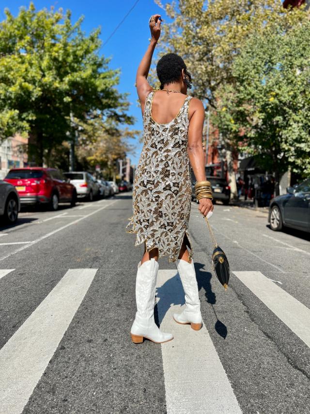 A treasured vintage beaded flapper dress by Swee Lo is given contemporary cool with the addition of white cowboy boots (a nod to Roberts’ Texan roots). A vintage handbag and jewelry complete the look.