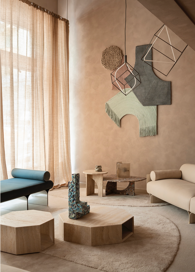 They might be the pale mint color of a macaroon, a beige the texture and shade of face powder, or a tactile coral as delicate and fuzzy as the skin of a peach. There will be esoteric collections, decorative things that are there to delight the eye; a ceramic bull’s head, a barnacle encrusted vessel, a group of rocks grouped together to establish a mood. Who lives here? An archaeologist from the future? Shapes beget other shapes, so a rug is no mere rectangle but an amorphous, textural island; mirrors drip with fringe, a classical pediment holds a stone fragment or a giant shell.