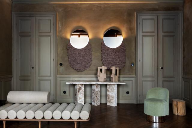 The Studio’s signature style always involves contrasting and clashing materials, unexpected combinations of elemental ingredients like stone or concrete teamed with buttery leather, silks and velvets. Even floors are exploited as a canvas for color, often carpeted in smooth swathes of pastel that echo the shades of the walls.