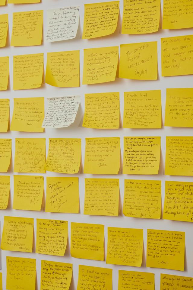 This is showcased perfectly by the wall of bright yellow post-it notes, which decorate her otherwise pared-back apartment. At the end of each dinner, Nirupa invites her guests to jot down some words about their experience. The result is a wall in her home, reminding her of how she is achieving her goal one dinner at a time.