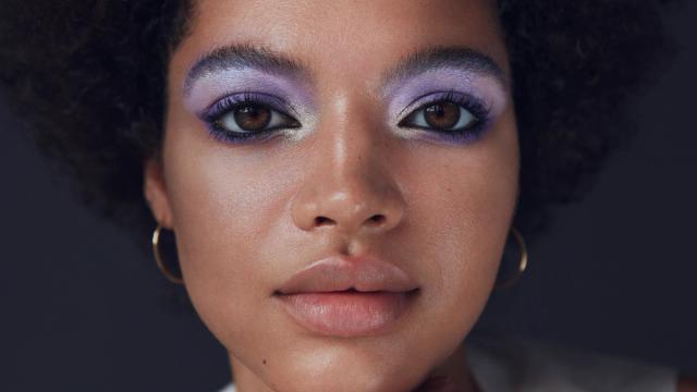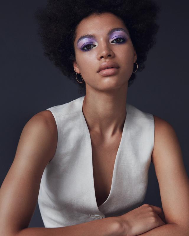 Willow’s love of sparkle and iridescence started early. “I remember loving a gold shimmery eyeshadow that was my mother’s,” says the Gen-Z scholar. Here, Dotti’s look puts a sophisticated spin on the carefree delight of glimmery makeup. Shades of deep purple and pale lavender fade gently into bursts of pearly white. Paired with combed up brows, the eyeshadow look feels at once down-to-earth and ethereal.