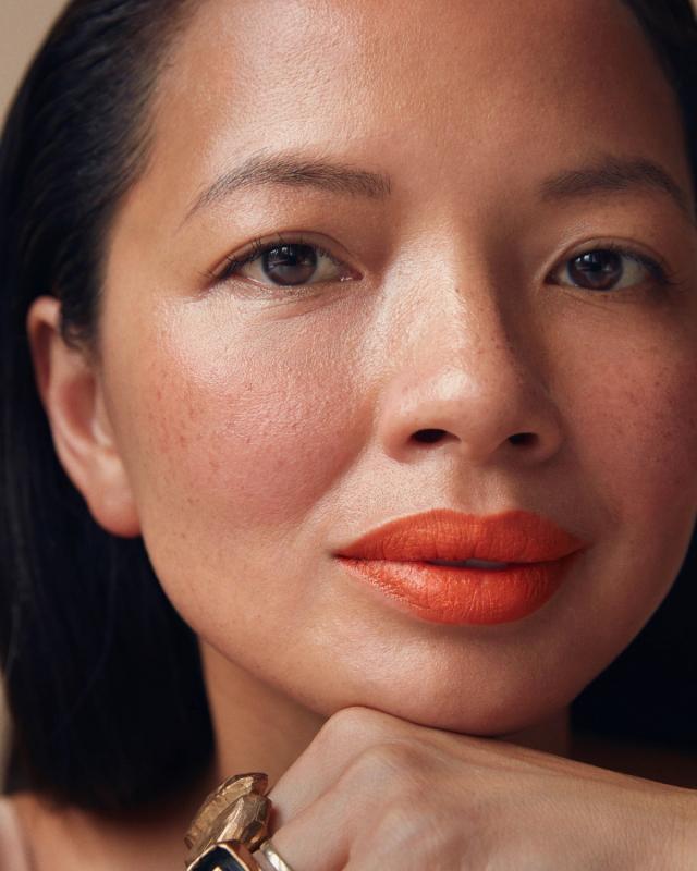Christine, a mother of 3 who, in her youth, experimented with a dark goth-leaning aesthetic, gravitates to classic lipsticks in blue-based reds and berry colors - the ritual gives her polish and boosts her mood. “You always know if I’m feeling tired because I will have bright red lipstick on,” she says. For the shoot, the makeup artist applied the luxurious Hermès lipstick in the less-expected Orange Boîte hue (which Christine promptly purchased for herself after the shoot).
