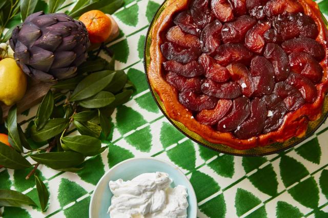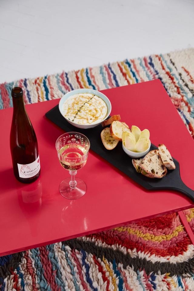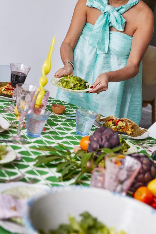 Such considered and vibrant flourishes - a joyous combination of traditional technique and creative flair - extends to the non-edible components of the dinner party. The tablescape, anchored by an arrangement of vibrantly hued artichokes, is an elegant hodge-podge of antique glass and stemware, vibrant linens procured on travels and at local estate sales and other personal curios.